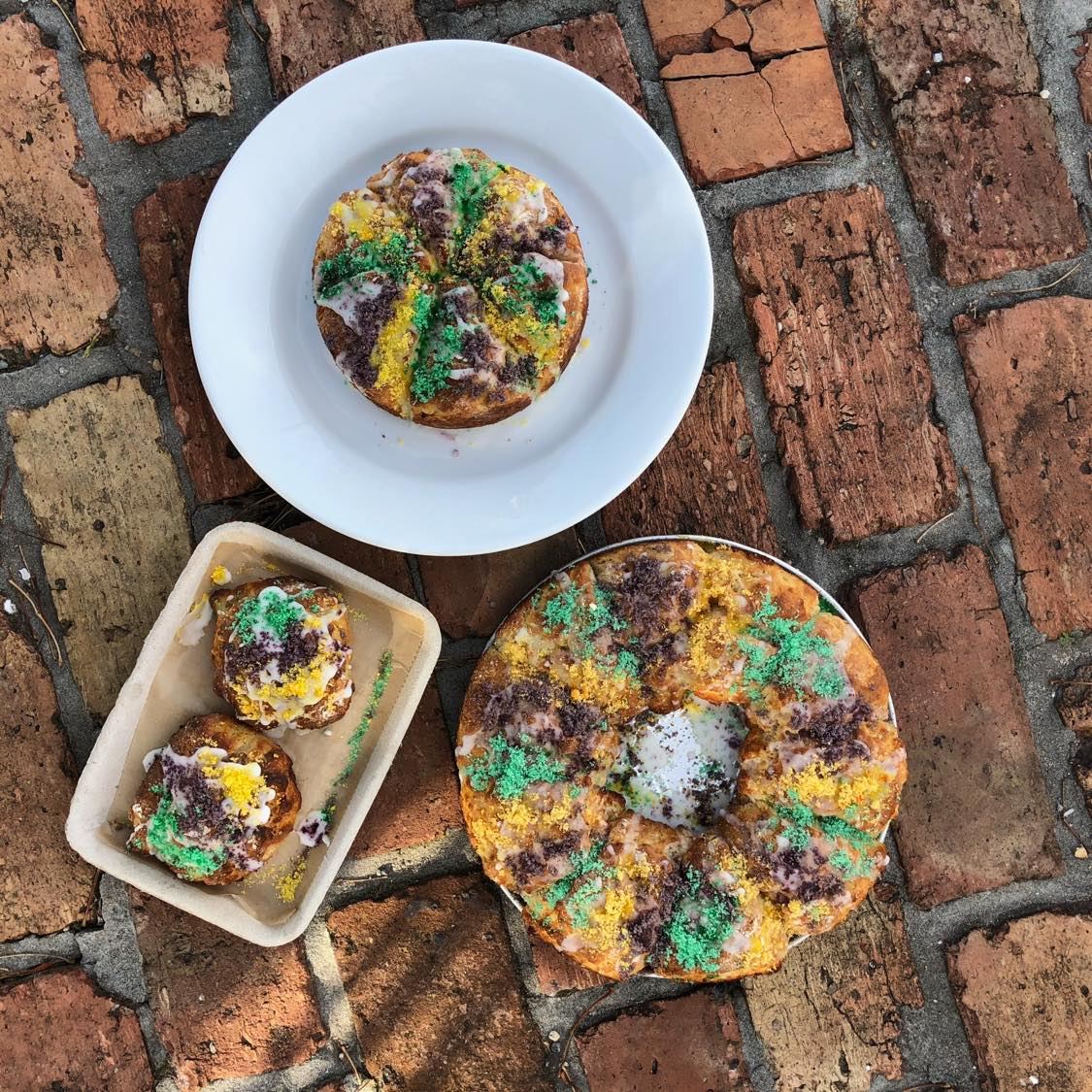 The Greenhouse in Biloxi and Ocean Springs offers king cake biscuits. Apple cinnamon biscuits are baked and topped with icing and sprinkles. Gluten free options are also available. Located at 152 G E Ohr Street in Biloxi and 404 Porter Avenue in Ocean Springs.